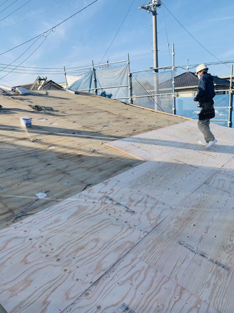 屋根の強度を確保するため、下地には新しい構造用合板を施工しました。