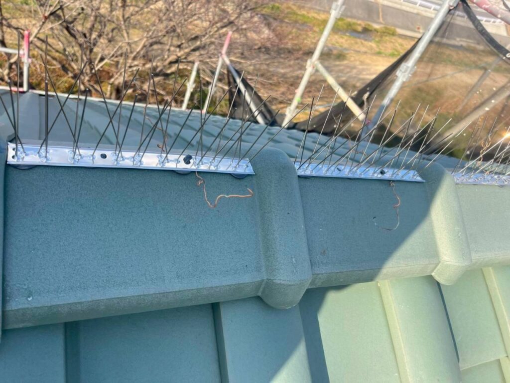 鳥が止まりやすい大棟や端部分にはステンレス製の剣山を設置。