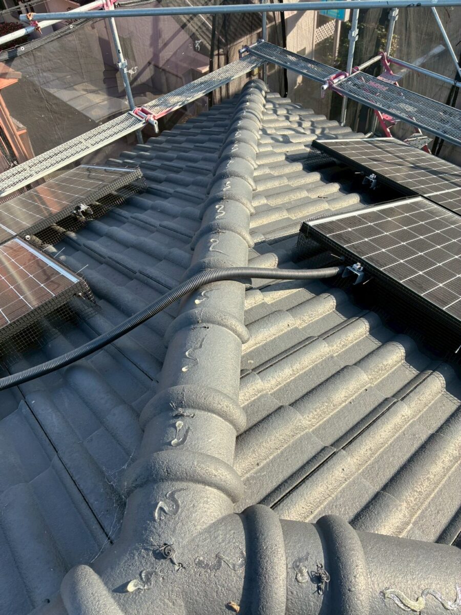 ソーラーパネルと瓦の隙間を専用の防鳥ネットでしっかりと塞いでいきます。