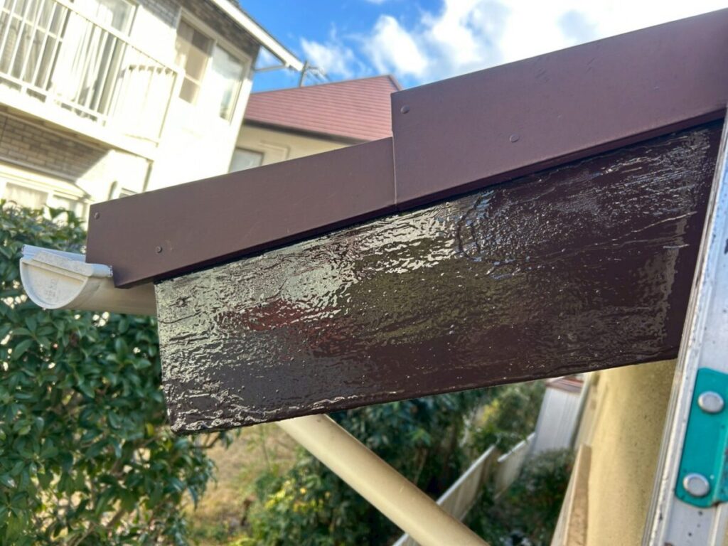 破風板が経年劣化により塗膜が剥がれ、一部では木部の腐食が始まっている状態でした。