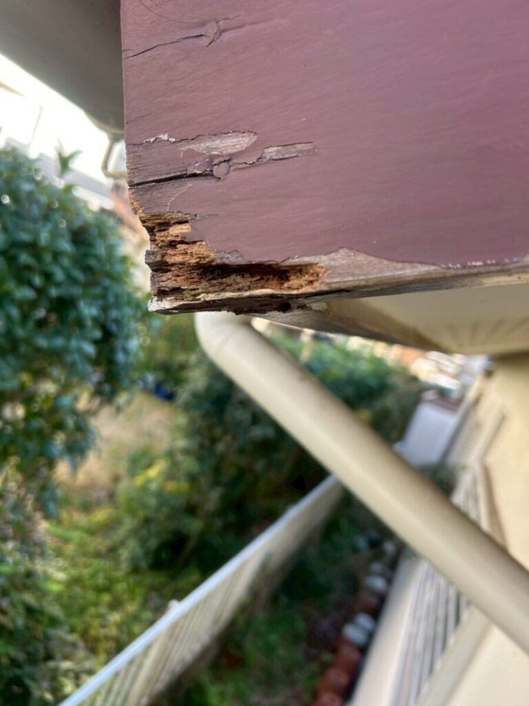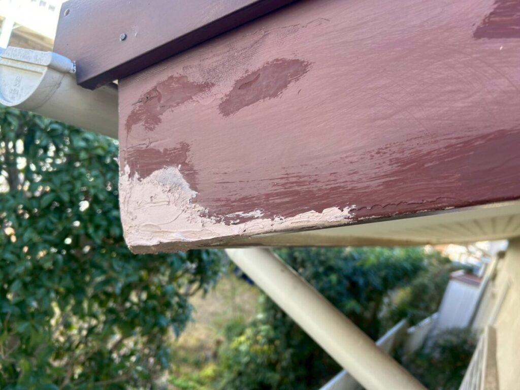 実際に確認すると、塗料の剥がれや木部の傷みが確認でき、早めの補修が必要な状況でした。
