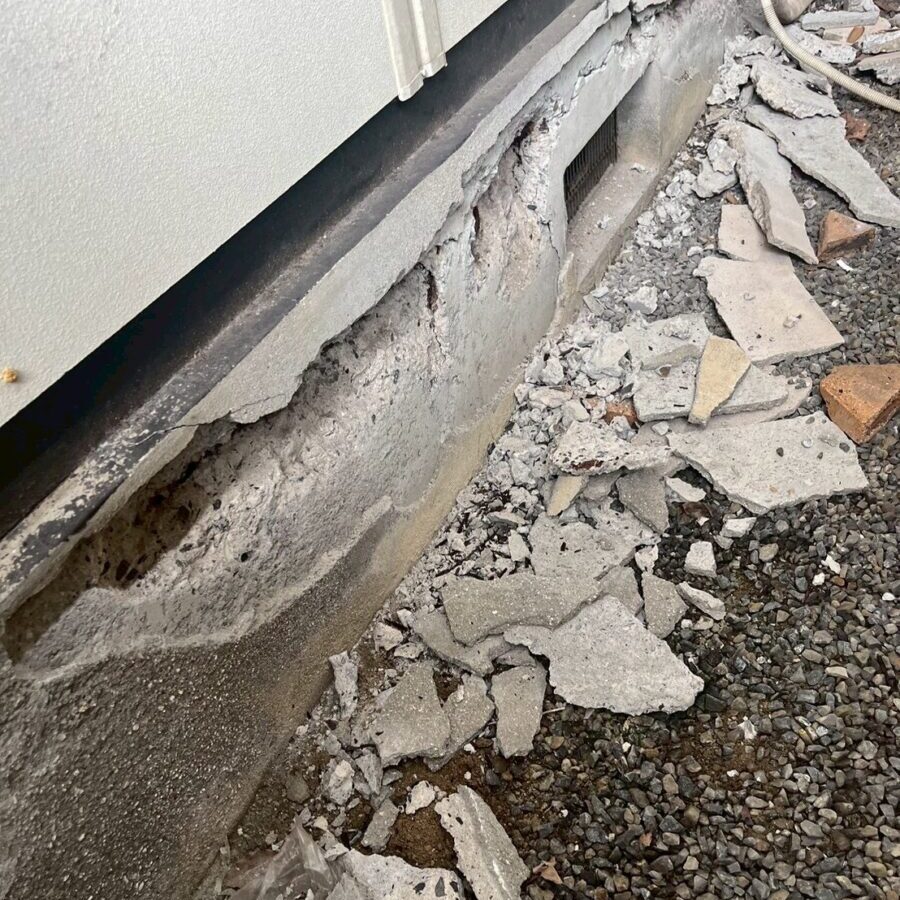 現地調査では、基礎の表層モルタルが大きく剥がれ、内部が露出している箇所が多数ありました。