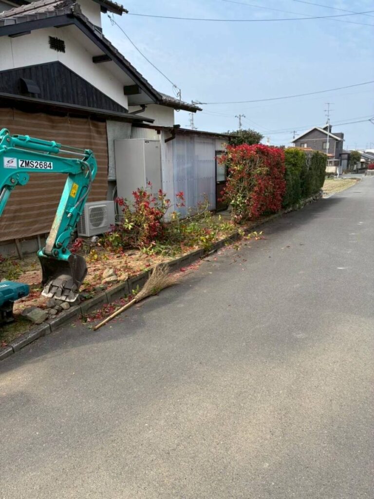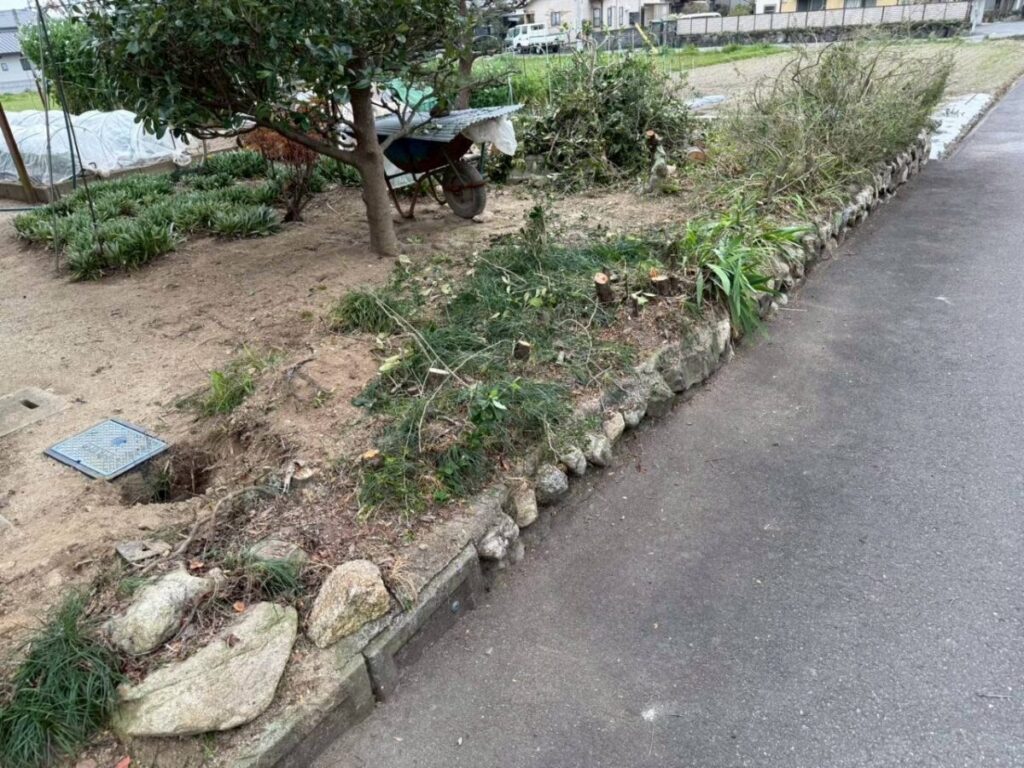 本日の工事はフェンスとブロックを設置する為に草木を抜根しています。