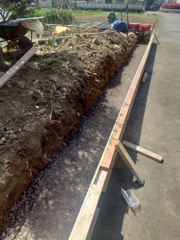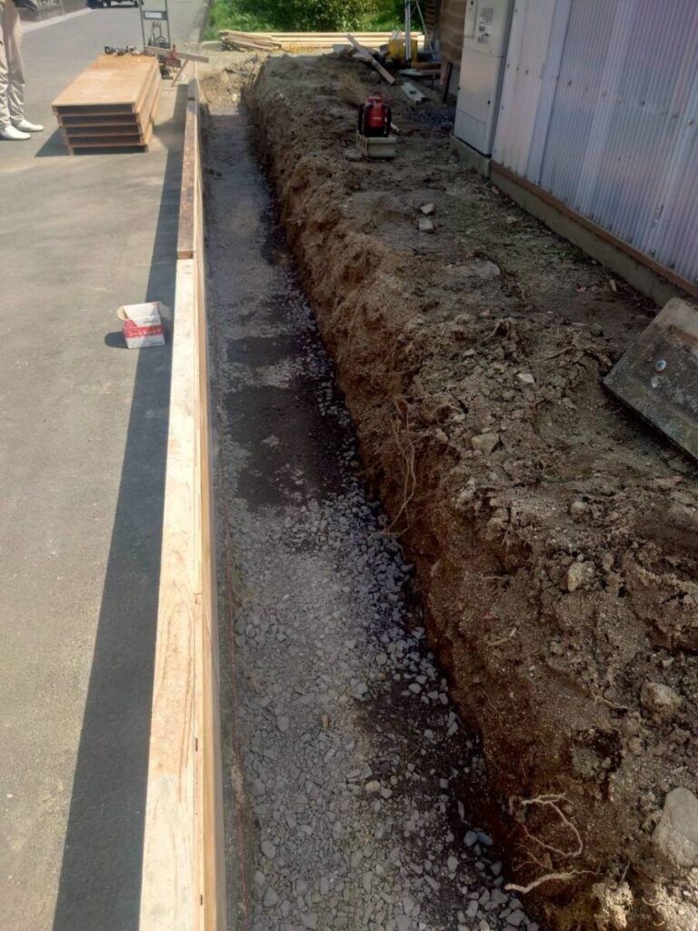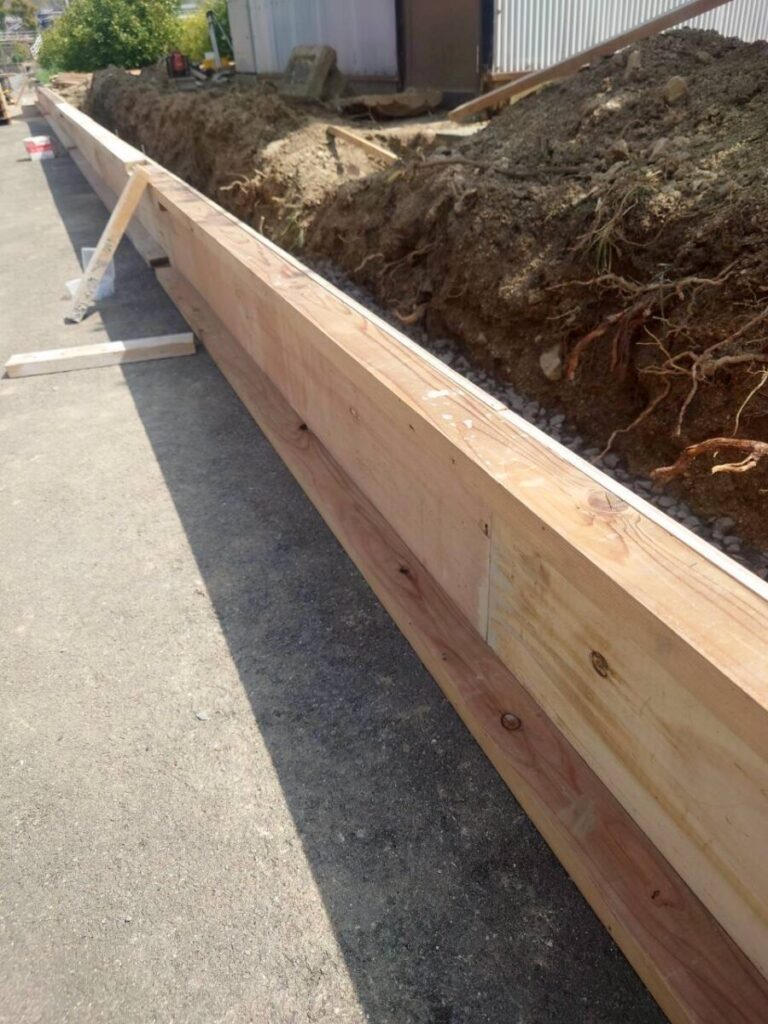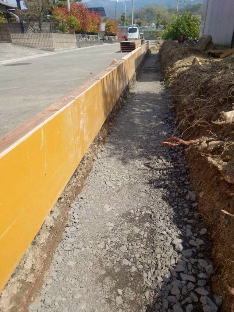次に型枠を組み砕石を敷、コンクリートベースを打てば下地の完成です。