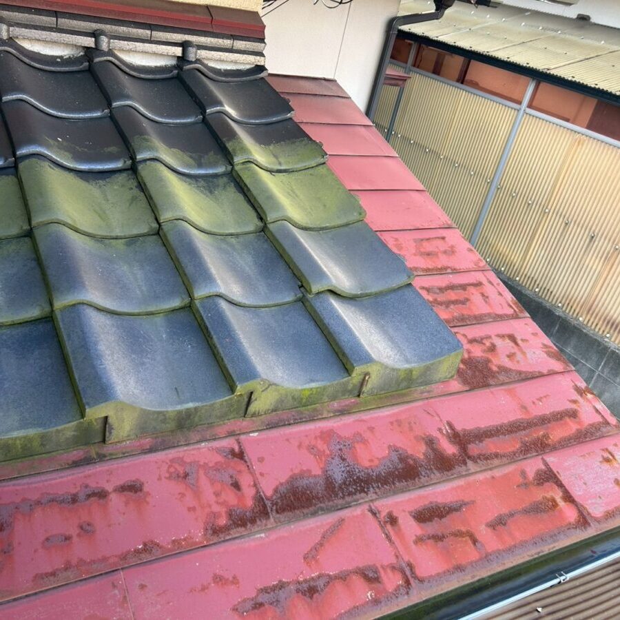 施工前の板金屋根は、経年劣化により塗膜の大きな退色・赤サビの発生・汚れ・苔の付着が見られる状態でした。