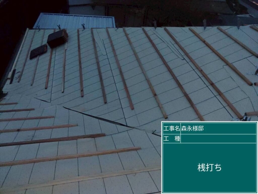 瓦を固定するための桟木(さんぎ)を打ち付ける作業です。