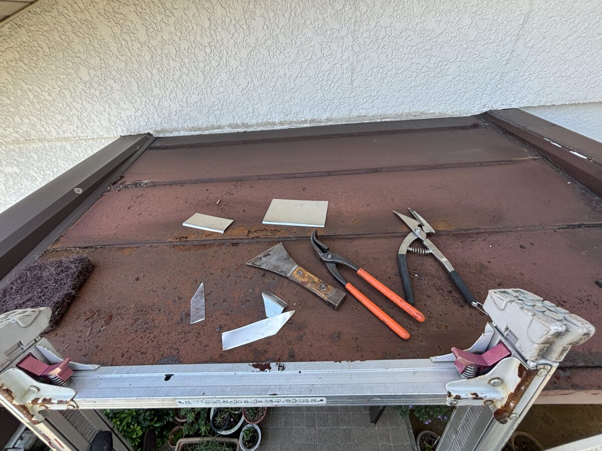 玄関上の板金に錆止めを塗布しています。 錆の発生を抑制する塗料 -